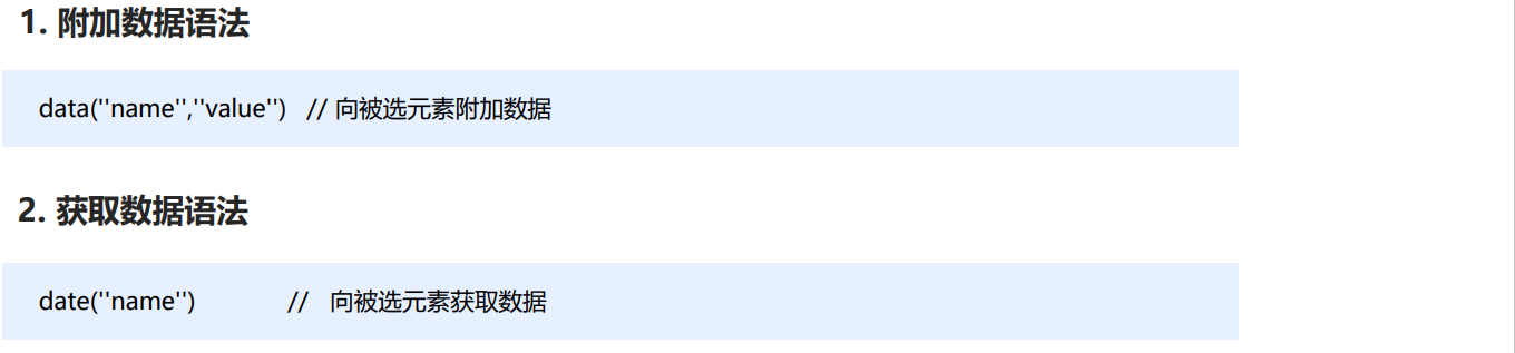 data() 方法可以在指定的元素上存取数据,并不会修改 DOM 元素结构。一旦页面刷新,之前存放的数据都将被移除。