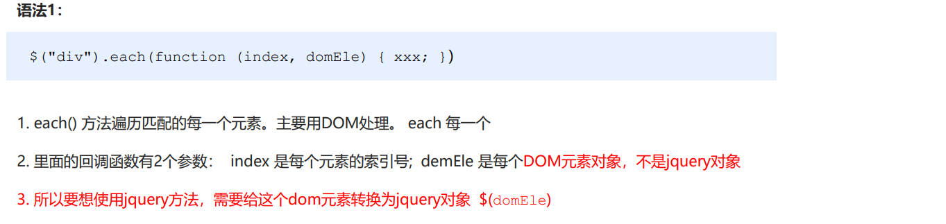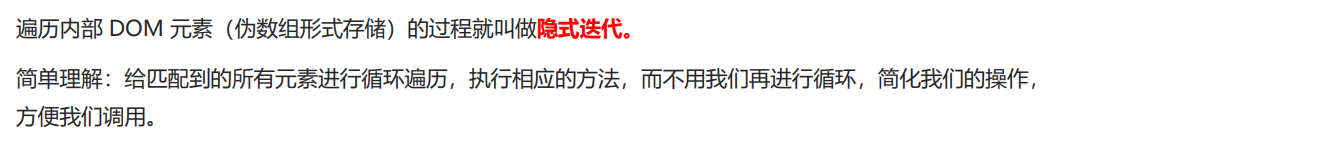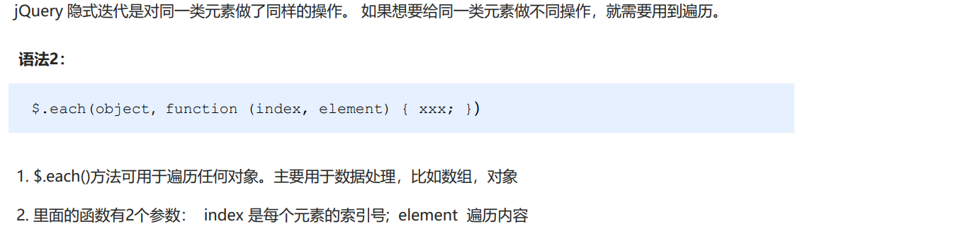 jQuery 隐式迭代是对同一类元素做了同样的操作。 如果想要给同一类元素做不同操作,就需要用到遍历。